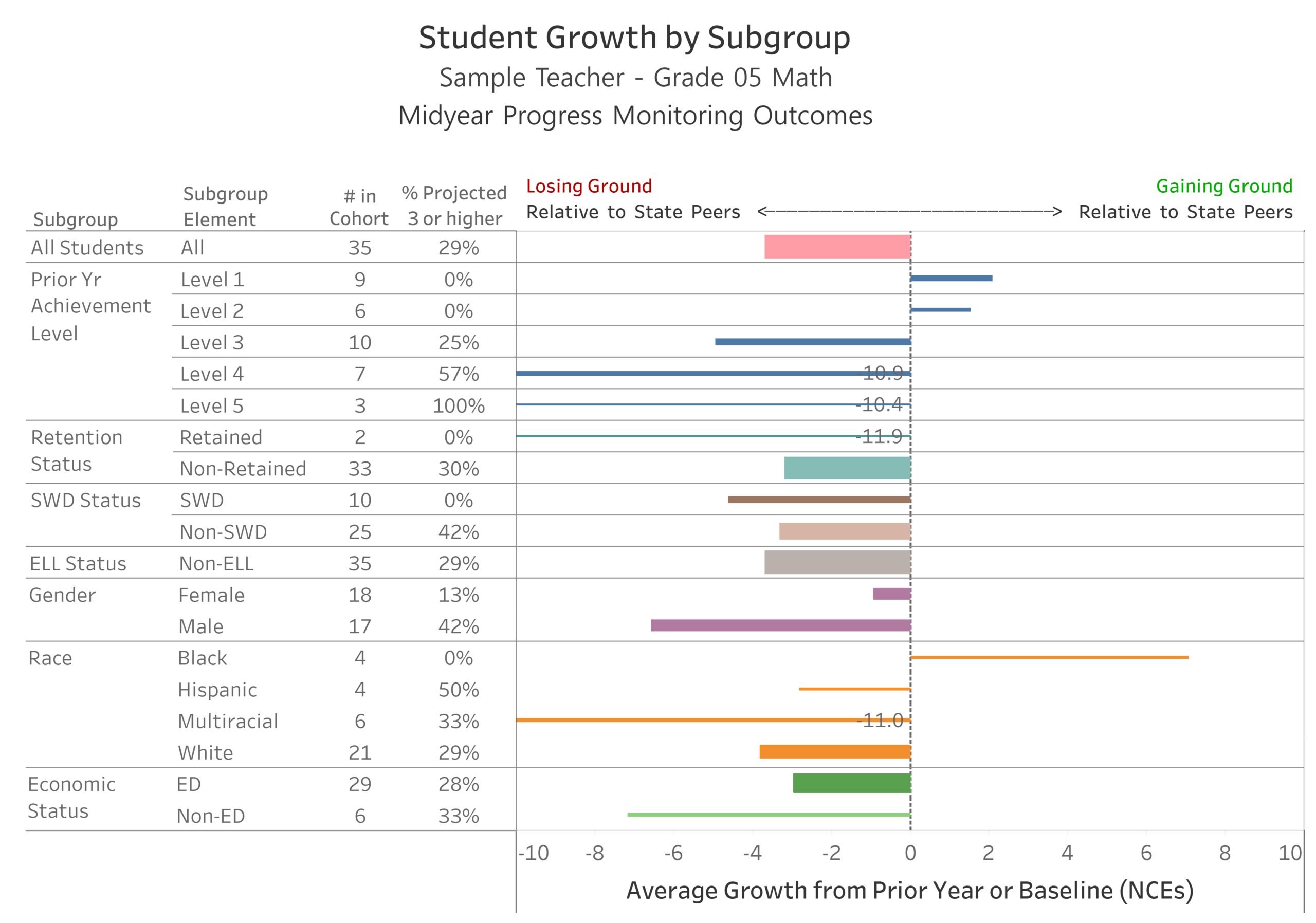 In our example, the principal might redirect as follows, “When I look at the overall average, I see students in your classroom are learning at a slower pace than their peers. Students who came in below grade level are growing at a faster rate, while higher-achieving students are growing at a slower rate, pulling the overall average down.” There is no judgment or emotion in this description of the data, but it is actionable. If the teacher knows which groups of students are best and least well-served by the current state of Tier 1 instruction, they will be better equipped to problem solve.
